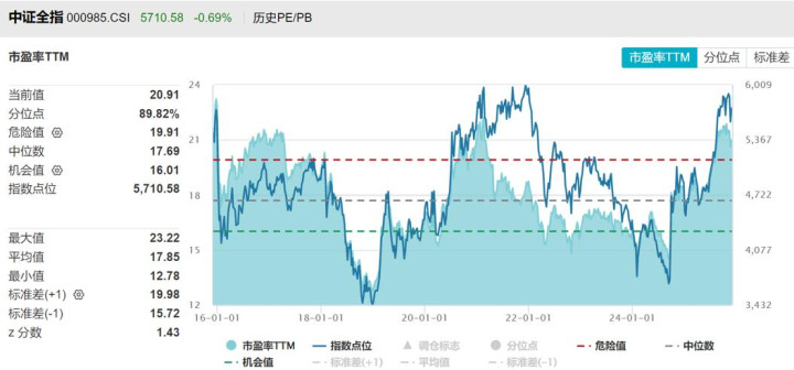 代表整个A股的中证全指市盈率为20.91倍,处于最近十年89.82%水平,算是估值较高了。