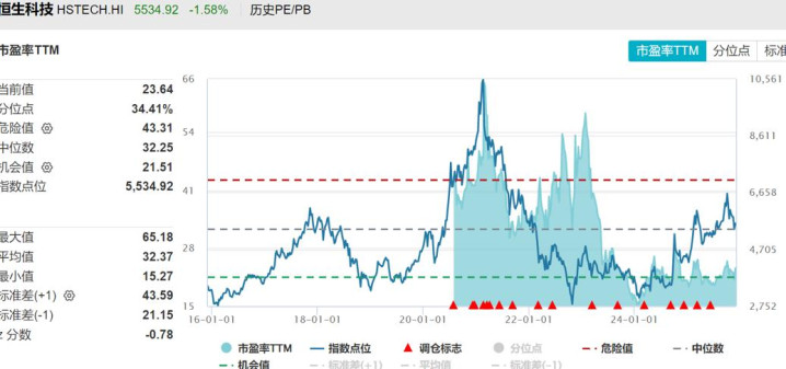 恒生科技市盈率为23.64倍,处于指数发布以来34.41%的水平,港股估值不贵。